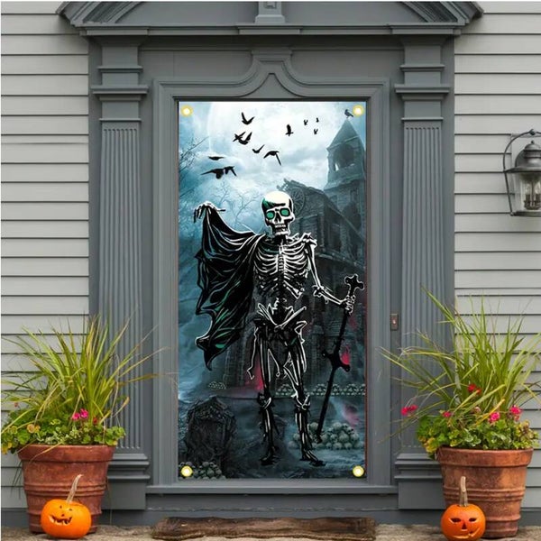 Met dit deurgordijn met skelet opdruk jaag je iedereen de stuipen op het lijf bij je halloween versiering of spooktocht. De angst om hier binnen te gaan zal groot zijn.