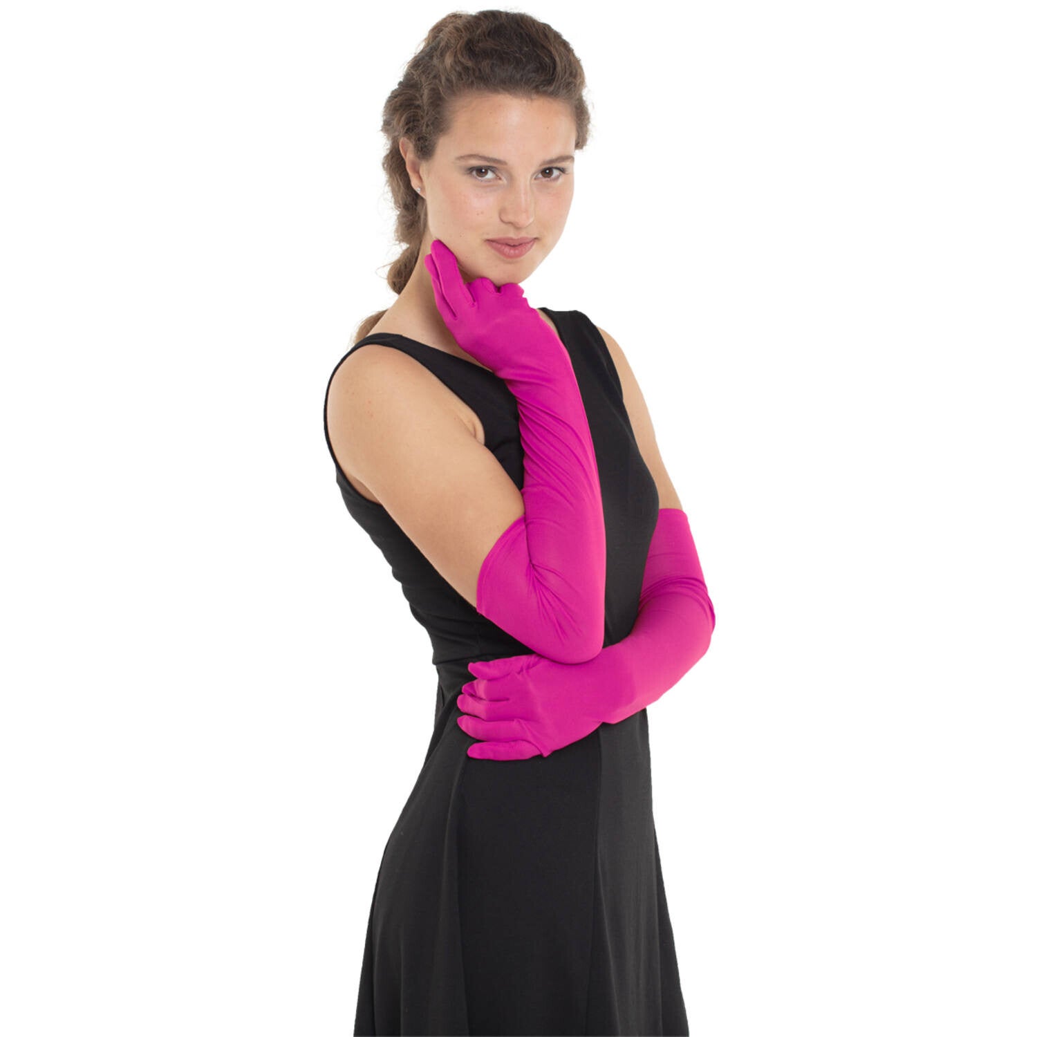 Lange roze handschoenen geven je je feestkleding of outfit een speelse uitstraling.Geschikt voor een themafeest, gala of valentijnsdag.