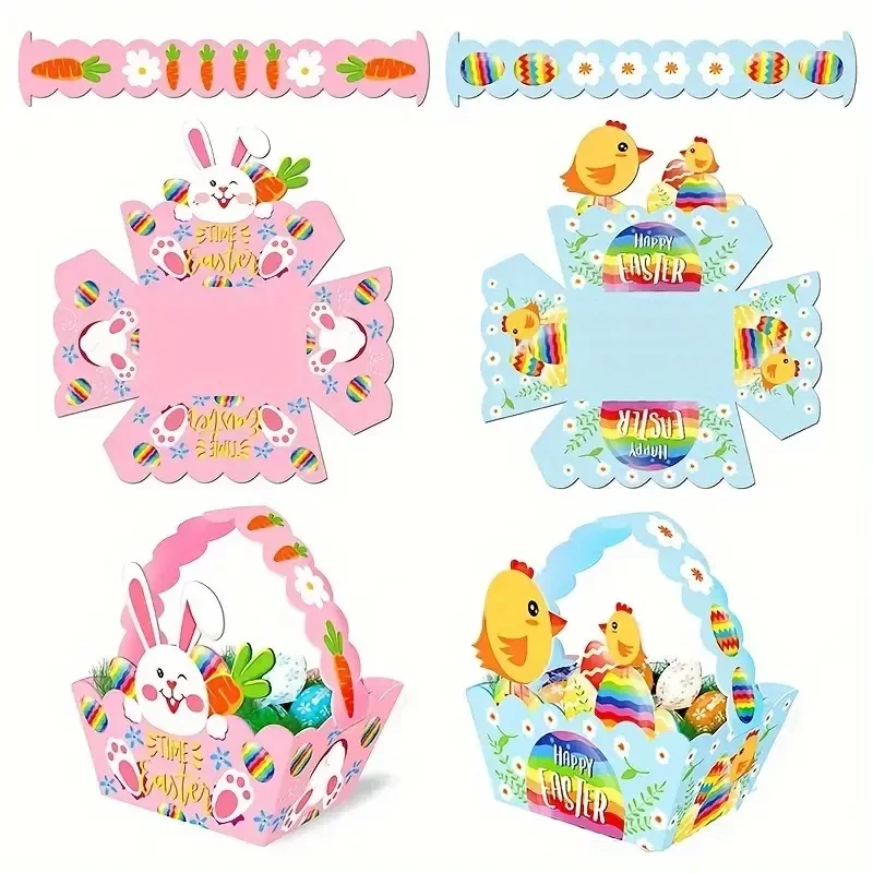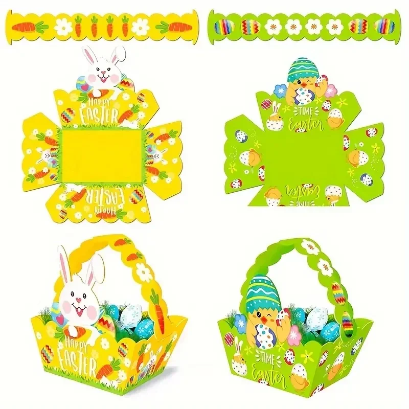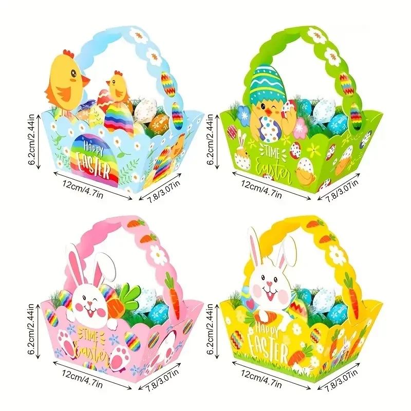4 vrolijke paasmandjes voor het bewaren van je paaseieren. Waren ze goed verstopt? Heb jij ze allemaal gevonden? Dan kan je tijdens de zoektocht dit handige paasmandje meenemen om je paaseieren te bewaren.