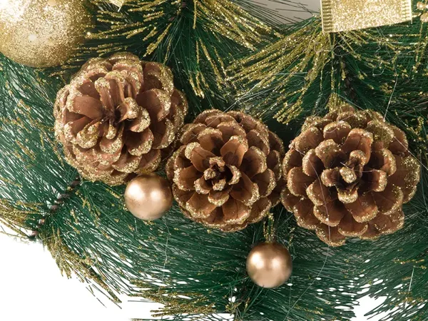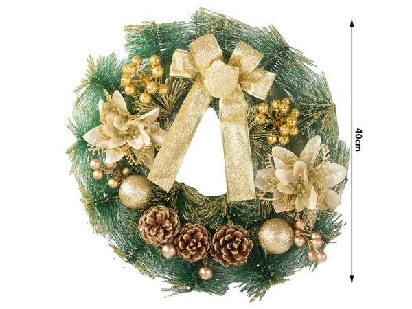 Hang deze kerstkrans voor je raam, aan de deur of aan een muur om je kerstdecoratie compleet te maken. De goudkleurige accenten maken het net wat anders dan het traditionele rood. Deze kerstkrans geeft net dat beetje extra versiering om een mooi kerstdecor te maken.
